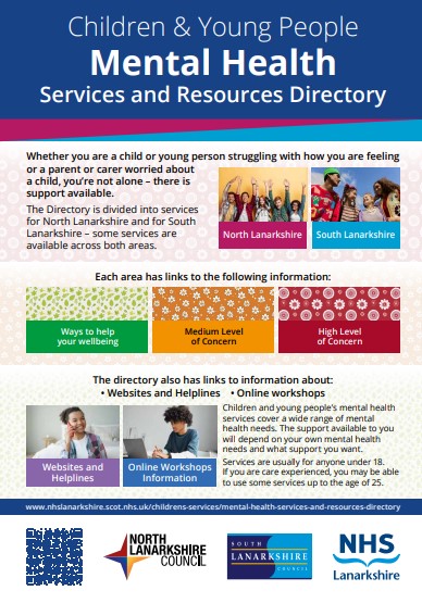 Please see the attached poster or click on the below link to download a copy. The poster promotes NHS Lanarkshire’s Children and Young People’s Mental Health directory – Services and Resources Directory | NHS Lanarkshire.